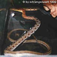 Wie man also sieht, ist die Toleranzgrenze dieser Art sehr hoch, trotzdem heißt das nicht, dass sich die Schlangen gerne handhaben lassen. Wenn man sie in die Hand nimmt, gibt die Gelbhalswassernatter eine Serie kurzer Zischlaute von sich und sondert ein für diese Art charakteristisch (und ziemlich übel) riechendes Sekret ab. Dieses Verhalten legt sich auch nach längerer Haltung nicht.