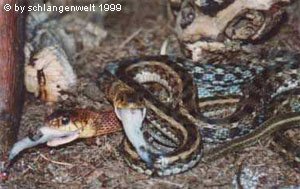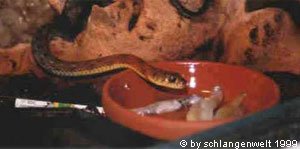 Als Alternative bleibt damit nur das Anbieten von Fisch und Fischfilet in verschiedenen Variationen. Die Nattern haben mitunter sehr eigene Vorstellungen von ihrem Futter, meine Schlangen fressen beispielsweise ausschließlich aufgetaute Stinte. Fischfilet wird nur ungern angenommen und lebende Fische im Wasserbecken nicht als Beute erkannt. Trotz der heftigen Bewegungen der Fische im Wasserbecken schwimmen die Schlangen lieber mit dem Fisch, als ihn zu fangen und zu verspeisen.