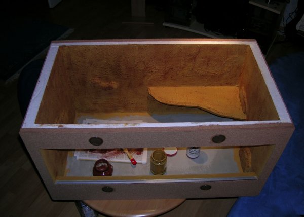 Des öfteren werden auch Becken aus Styropor/Styrodur verwendet - diese haben viele Vorteile wegen der guten Isolierungseigenschaften von Styropor und ihrer leichten Bauweise. Wenn man dieses Baumaterial verwendet, muss man die Fronten natürlich nach Geschmack verkleiden. Die Rückwände kann man z.B. mit Zierkorkplatten, da es dem Becken zum einen ein schönes, natürliches Aussehen verleiht und sich aufgrund der Struktur auch dem Bewegungs- und Kletterdrang einiger Schlangenarten genügen kann. Ein weiterer Vorteil - Auf dem Kork sieht man keine Kalkreste vom Sprühwasser. Nachteil: Zierkork ist leider ein sehr teueres Vergnügen - am günstigsten kann man dieses Material aber auf Reptilienbörsen erwerben. Wer handwerklich geschickt ist, kann für die Rückwände auch Styropor verwenden. Auf die Rückseite des Terrariums geklebtes Styropor lässt sich z.B. unter Zuhilfenahme einer Lötlampe formen, so dass man eine strukturierte Oberfläche erhält, die man anschließend mit einer Latex- oder Acrylfarbe naturecht einfärben kann, ein wenig künstlerisches Geschick vorausgesetzt.
